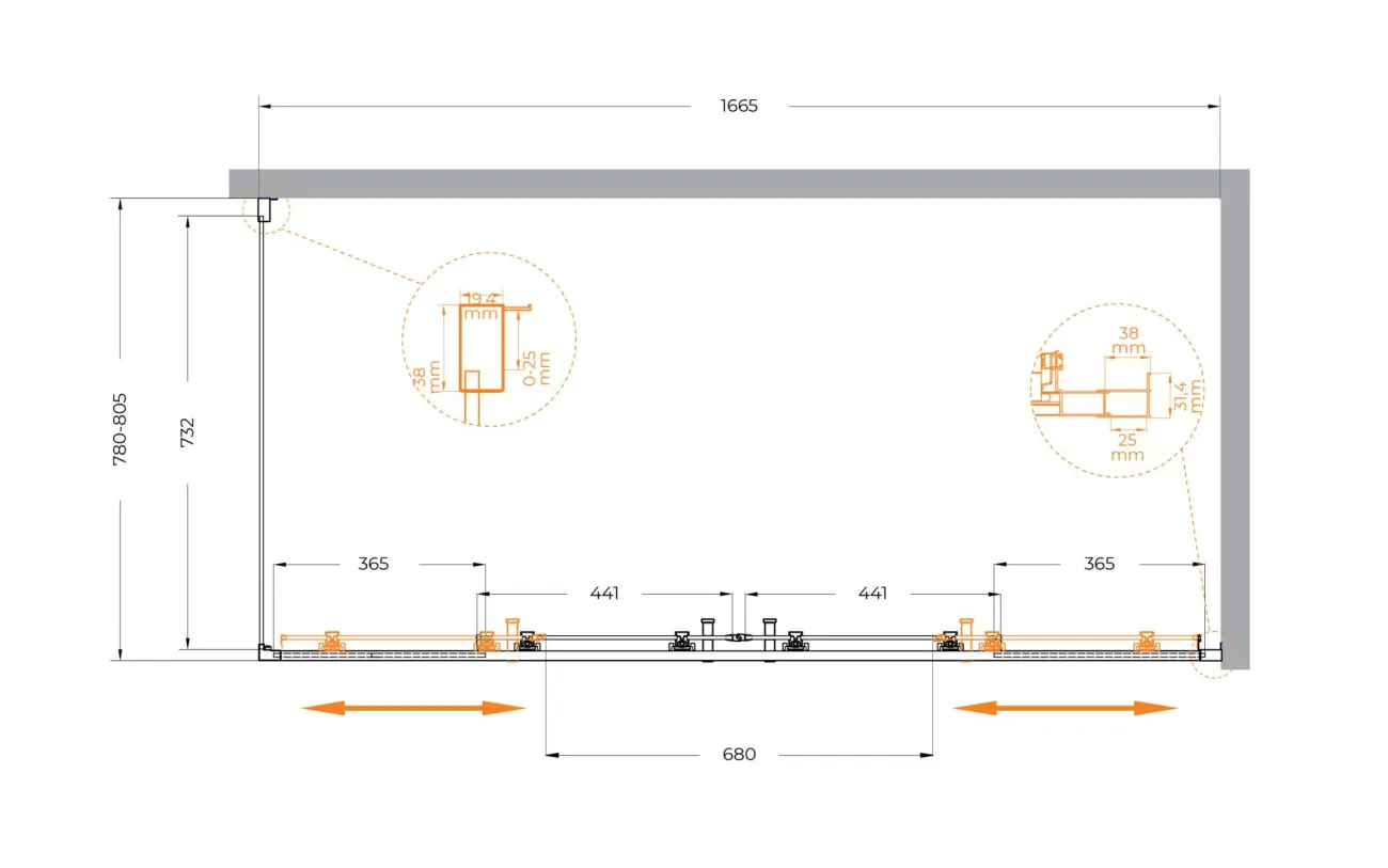 - Регулировка ширины: предусмотрена за счет боковых профилей.