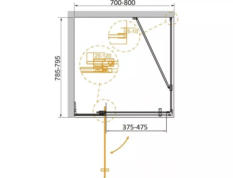 - Конструкция петли позволяет регулировать ширину входа душевого ограждения в диапазоне 10 см