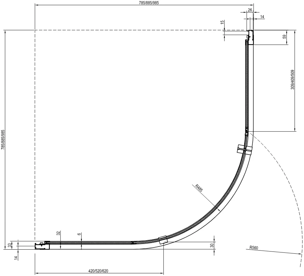 Изделие состоит из двух прямых неподвижных частей и одной изогнутой части, образующей дверь поворотного типа. Повернув изделие на 180°, получите левый/правый варианты входа. Устанавливается в облицованный кафелем угол ванной комнаты на поддоны RAVAK RONDA, ELIPSO, ELIPSO PRO, ELIPSO PRO FLAT, ELIPSO PRO CHROME или непосредственно на пол со встроенным душевым каналом.