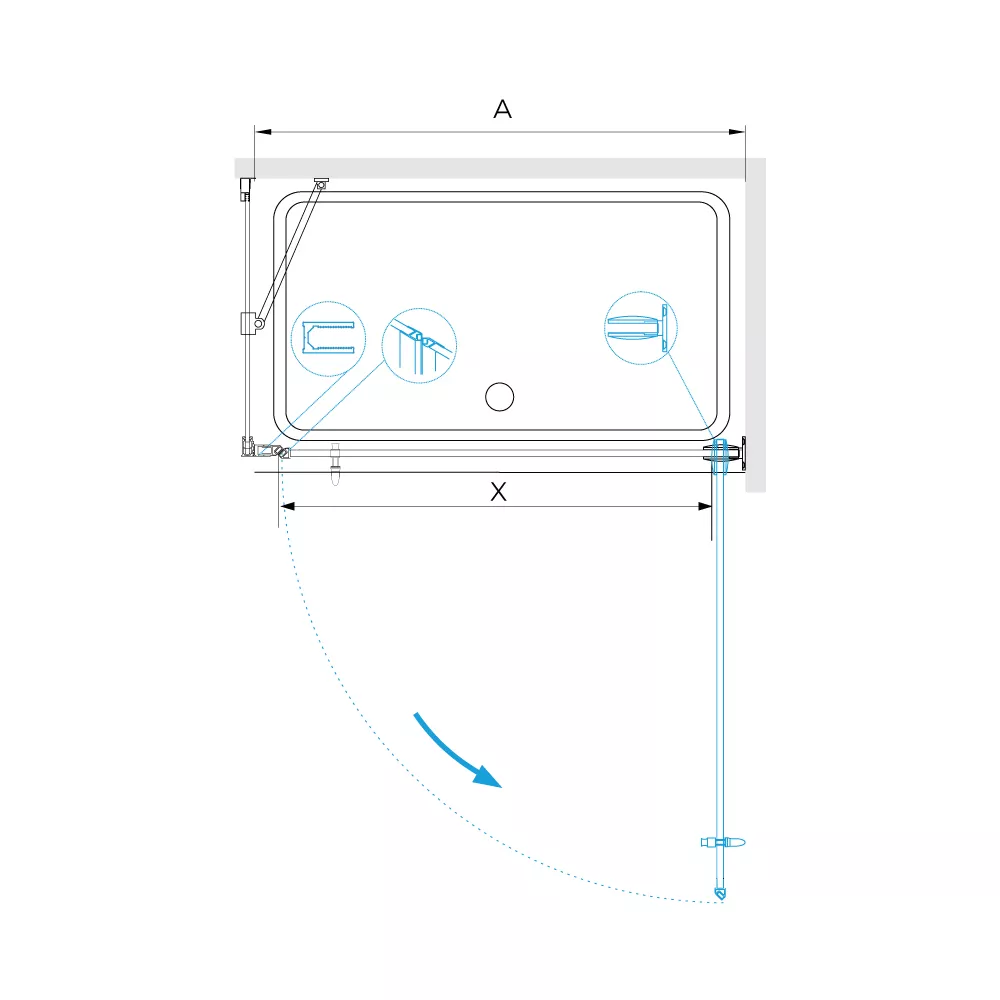 Душевой угол с распашной дверью распашная. В комплекте нижняя пороговая планка. Трап или поддон приобретается отдельно.