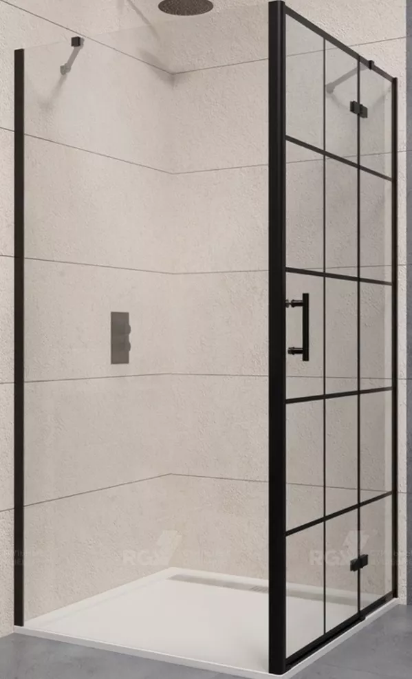 Эффектная распашная дверь в обрамлении черного алюминиевого профиля дополнена оцинкованными петлями в цвет. Обратите внимание, что петли у данного уголка находятся справа, а около неподвижной части удобно установить место для умывания, мебель для хранения или технику.