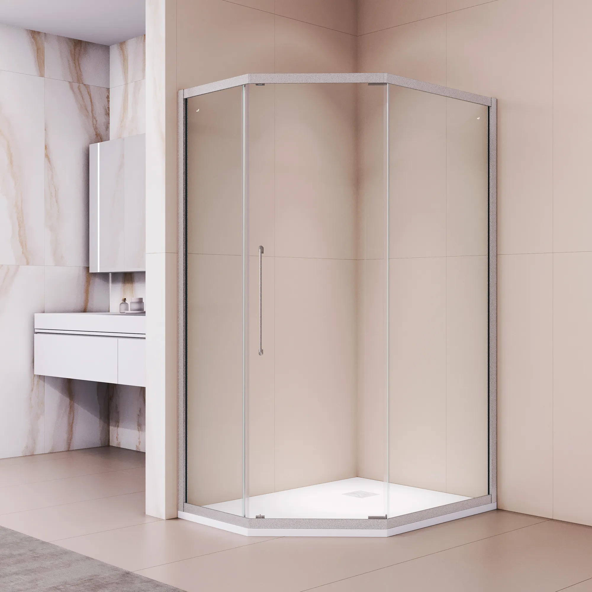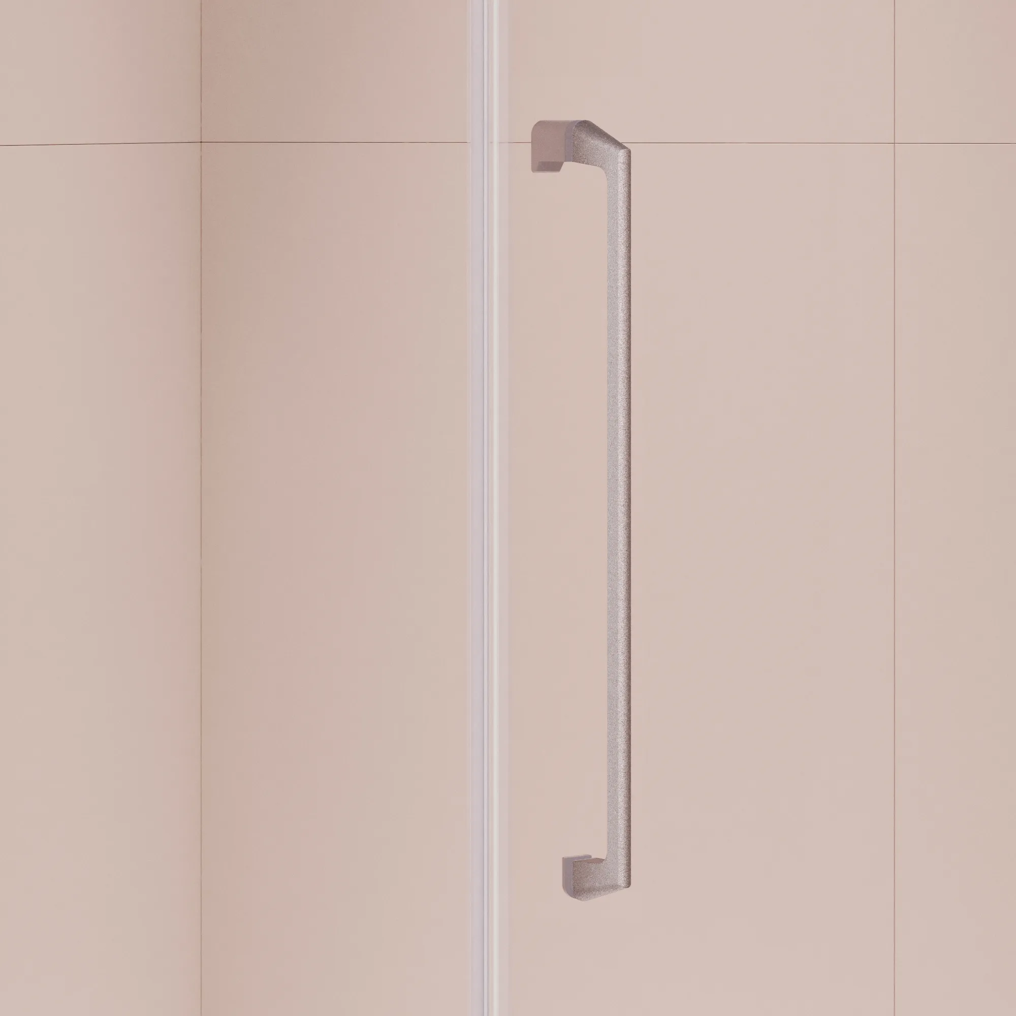 Трапециевидная форма позволяет установить изделие даже в минимальном пространстве, при этом внутренний объём остаётся просторным. По бокам легко разместить тумбу или стиральную машину. Конструкция включает три стеклянных полотна: два стационарных и одно подвижное. Дверное полотно при нажатии на ручку плавно сдвигается вдоль стационарной панели, не занимая дополнительного места — это идеальное решение для малогабаритных ванных комнат.