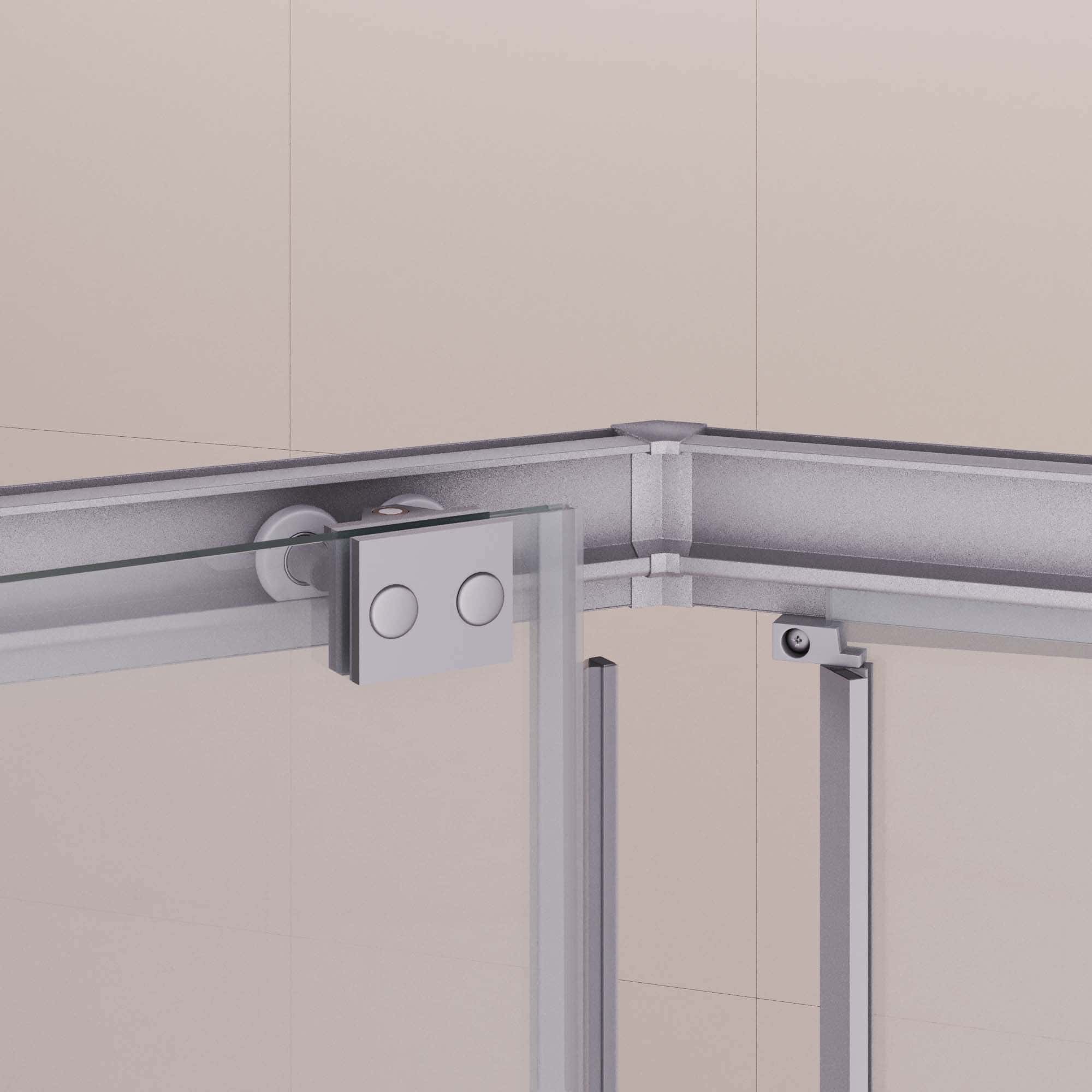 Ограждение для душа выполнено из закалённого стекла и усилено рамой из анодированного алюминия. Уникальность модели заключается в раздвижной (откатной) двери, которая формирует герметичное пространство душевой зоны, сохраняя максимум свободного места. Благодаря срезанному углу от квадратной формы душевой уголок особенно удобен для компактных ванных комнат или массажных кабинетов.
