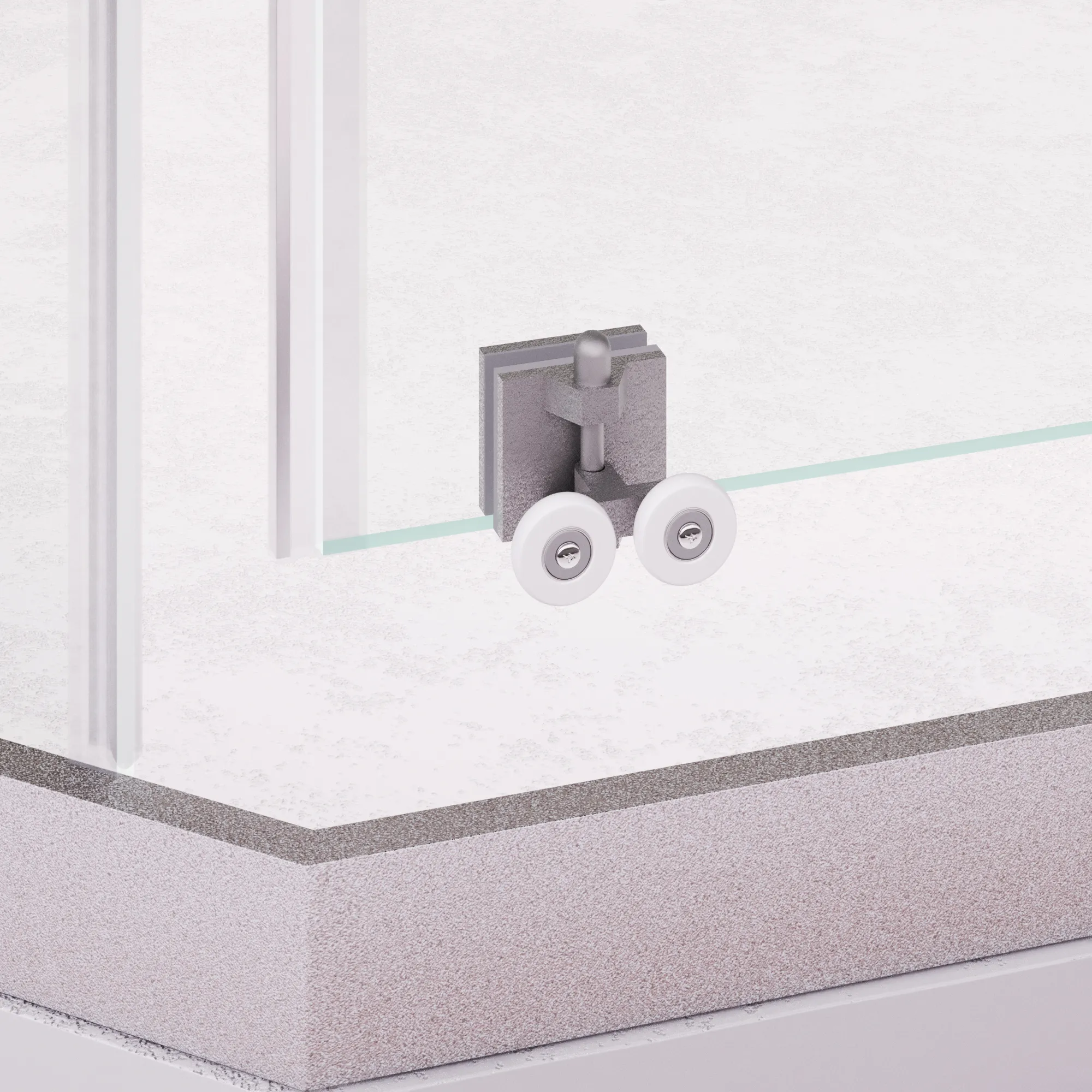 Двойные ролики скользят по верхнему и нижнему П-образному профилю. Нижний роликовый механизм оснащён системой «took off clean» — ролики можно отстегнуть для чистки стекла и профиля. При генеральной уборке дверное полотно полностью снимается. Фиксатор мягко амортизирует при открытии, обеспечивая бесшумное движение. Ресурс роликов — более 30 000 циклов (около 15 лет эксплуатации).