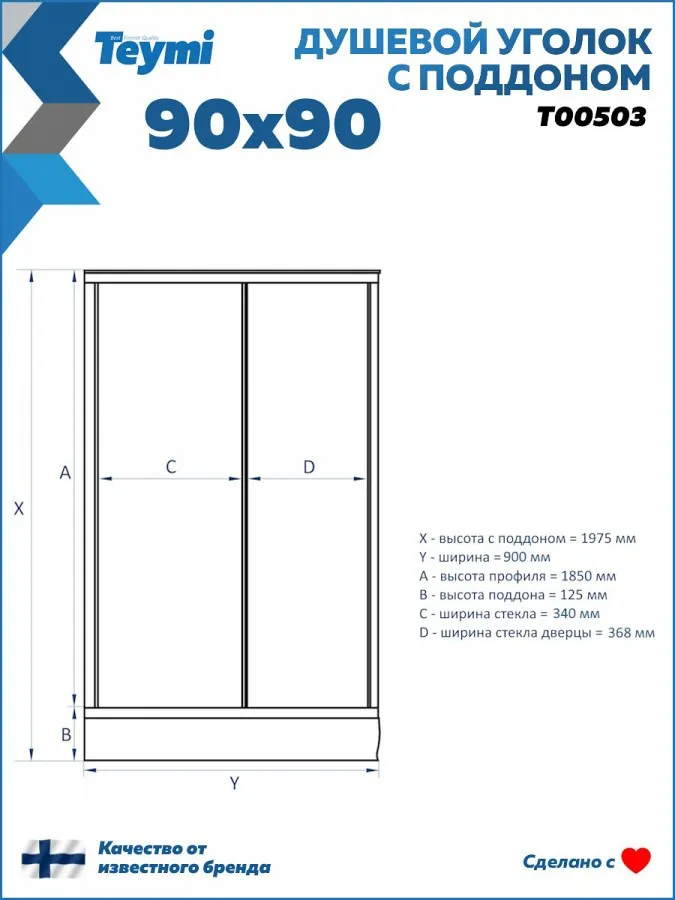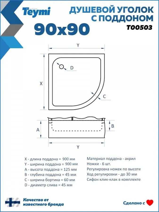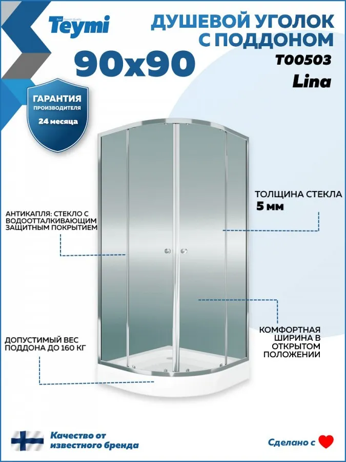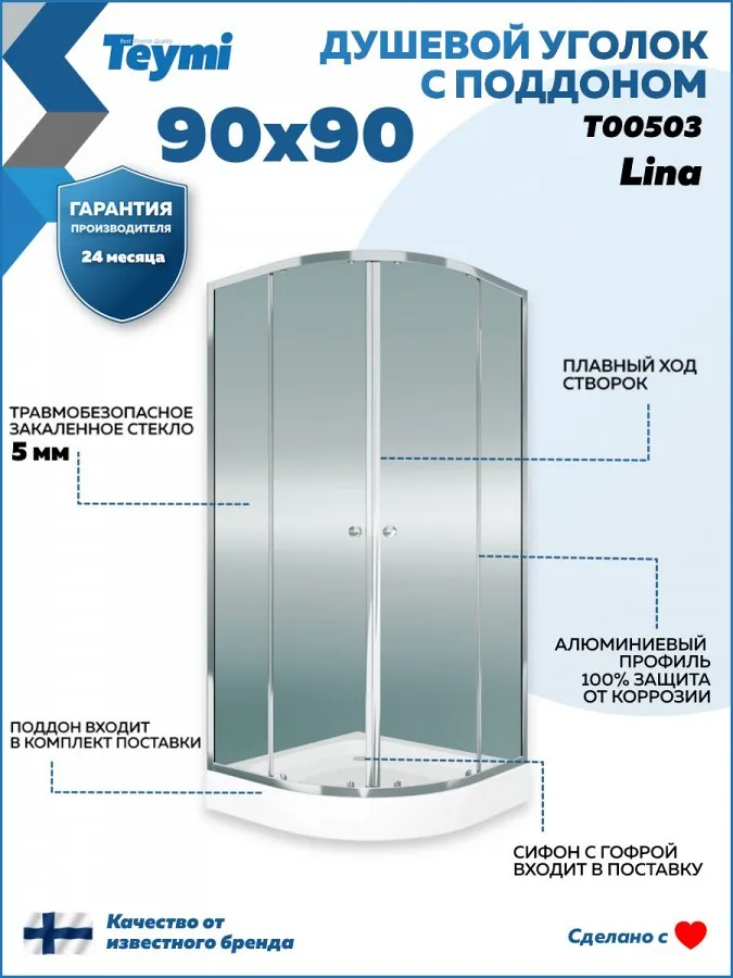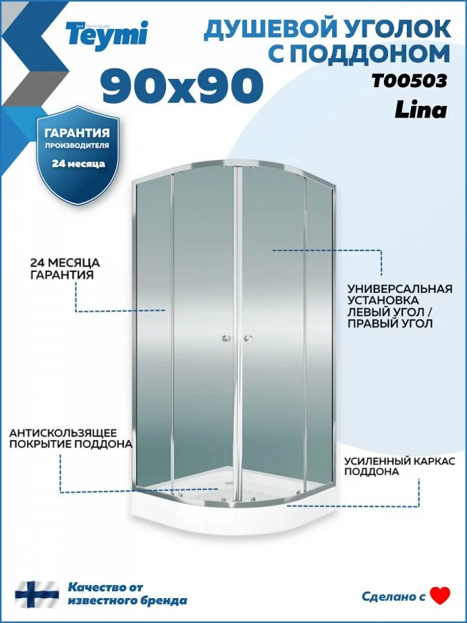 Душевой уголок Teymi Lina T00503 90x90, с поддоном, хром/стекло прозрачное