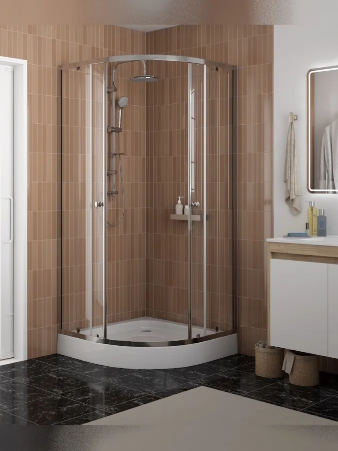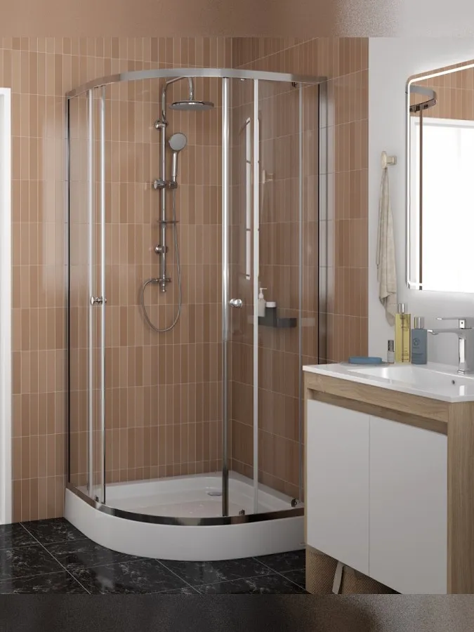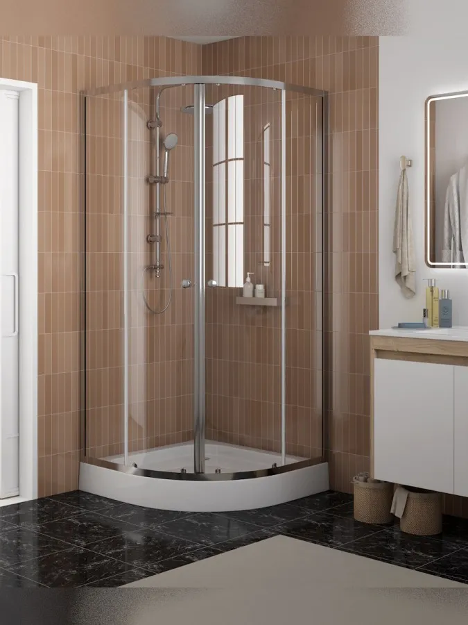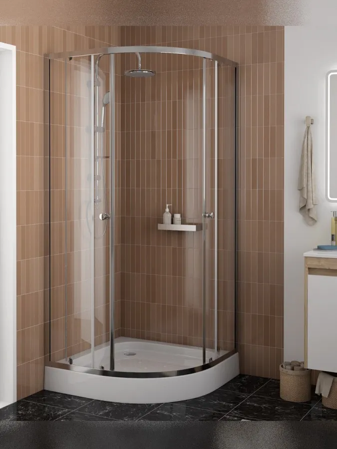 Комплектация: профиль, поддон, сифон клик-клак, стеклянные панели и двери, силиконовый уплотнитель, крепеж, ролики, документаци.