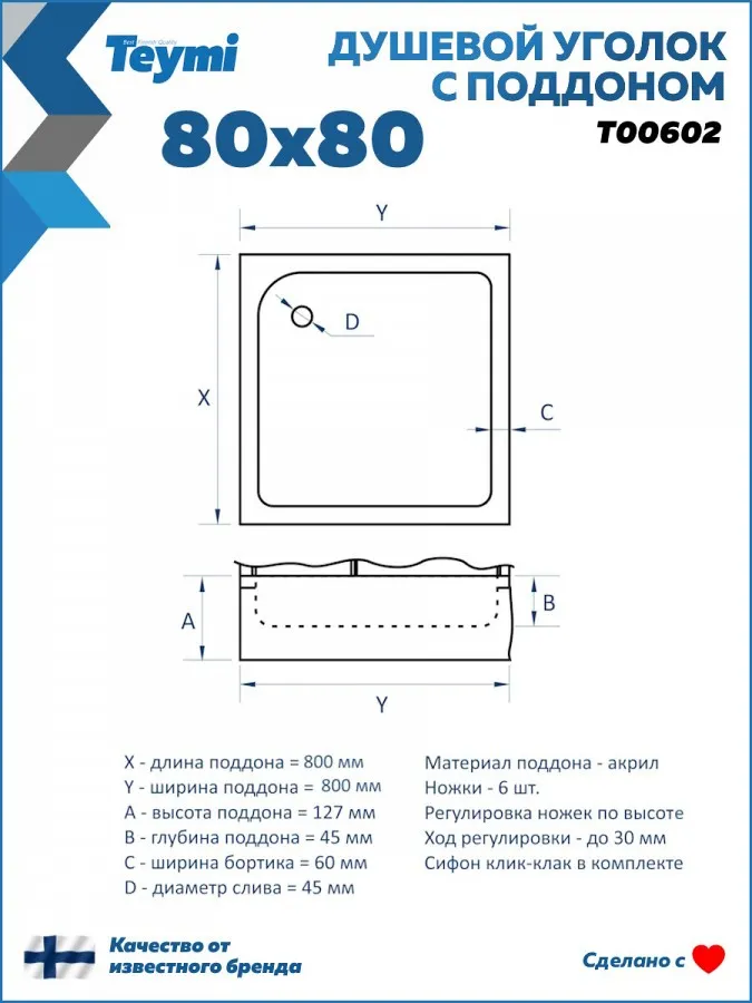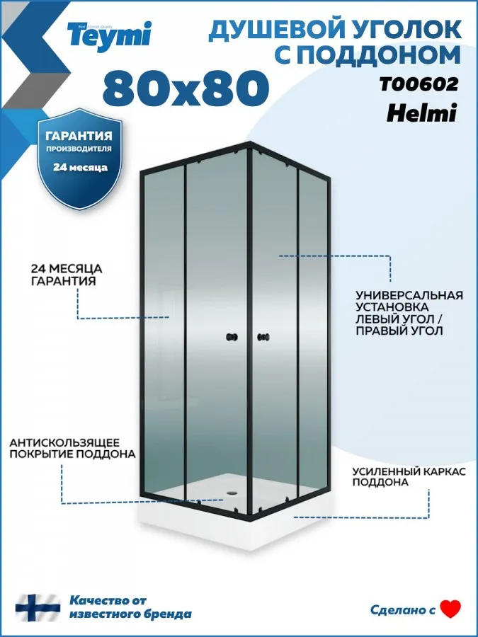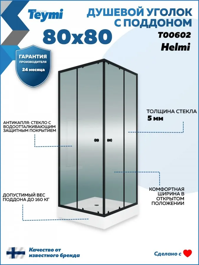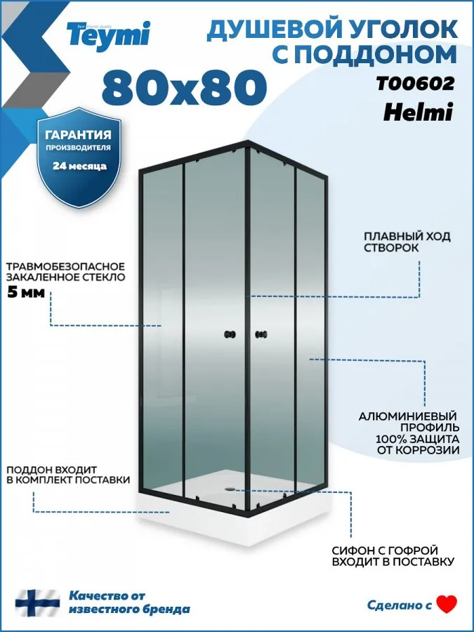 Душевой уголок Teymi Lina T00602 80x80, с поддоном, чёрный/стекло прозрачное