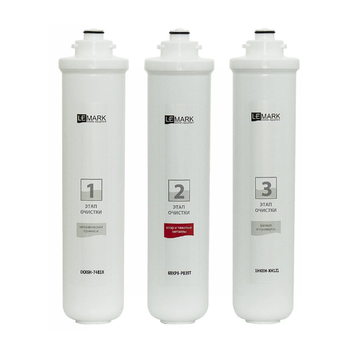 Комплект сменных картриджей BASIC для доочистки городской воды от продуктов хлорирования, тяжелых металлов и механических частиц. Подходит ко всем проточным фильтрам Lemark.