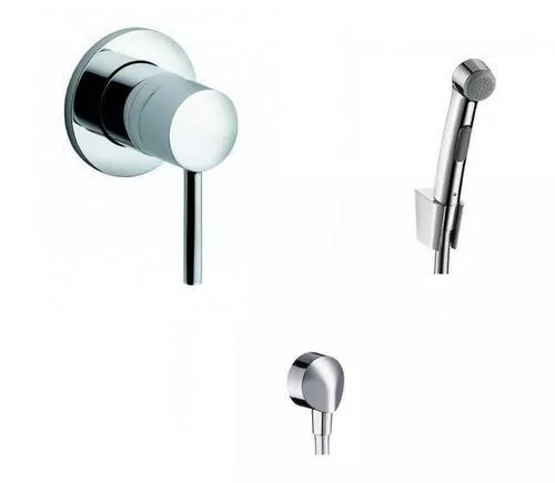 Комплектация: наружняя часть смесителя (389250576), встраиваемый механизм (38826N), комплект гигиенического душа Hansgrohe (32129), шланговое подсоединение Hansgrohe (27454).