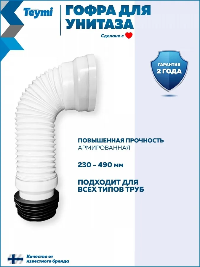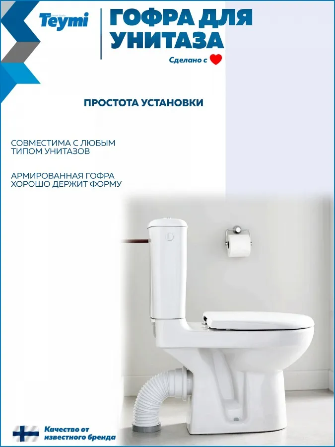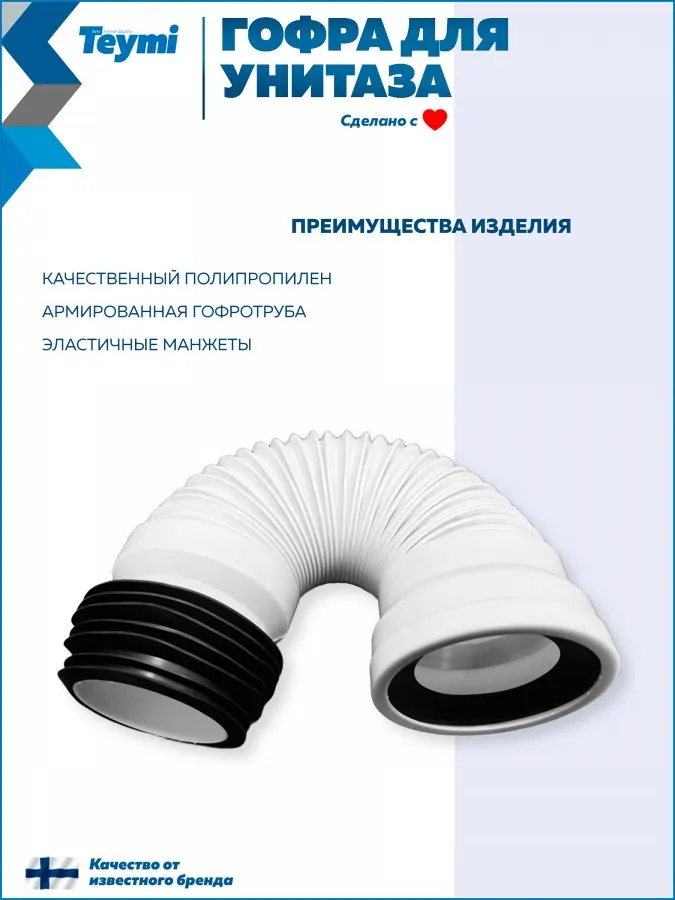 Гофра для унитаза Teymi T140117 — это универсальное решение для подключения сантехники к канализации. В отличие от стандартных мягких патрубков, эта модель является армированной, что обеспечивает ей повышенную прочность и способность сохранять заданную форму без провисаний.