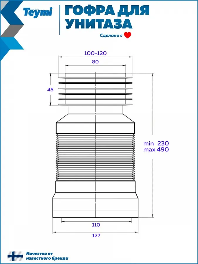 - Универсальность: благодаря широкому диапазону растяжения (от 230 до 490 мм) и эластичным манжетам, гофра подходит для большинства унитазов и канализационных труб.