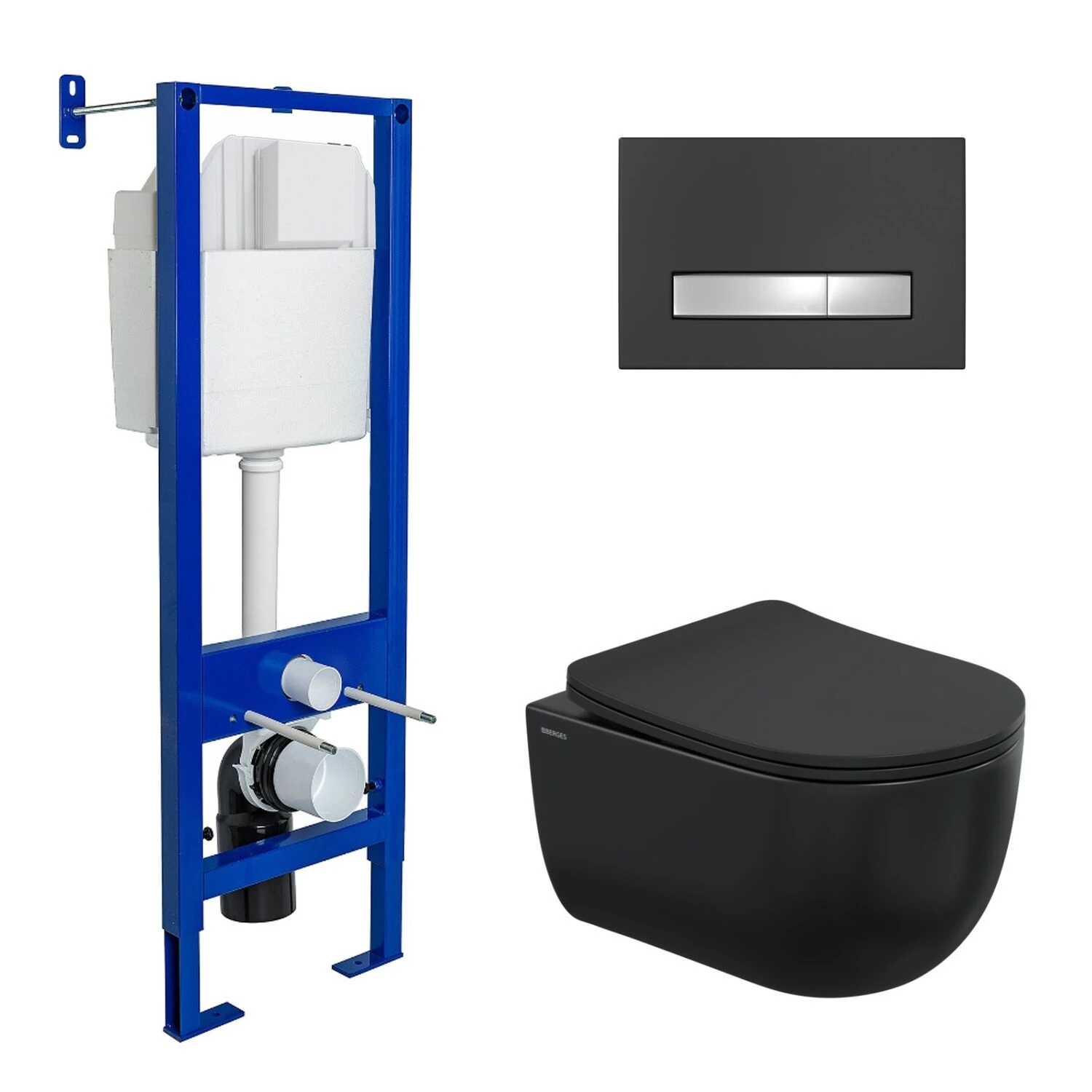 Инсталляция Berges Atom Line 410 + Ventas Black + кнопка Soft Touch черной/хром глянец, в комплекте с унитазом чёрный, безободковый, с сидением микролифт