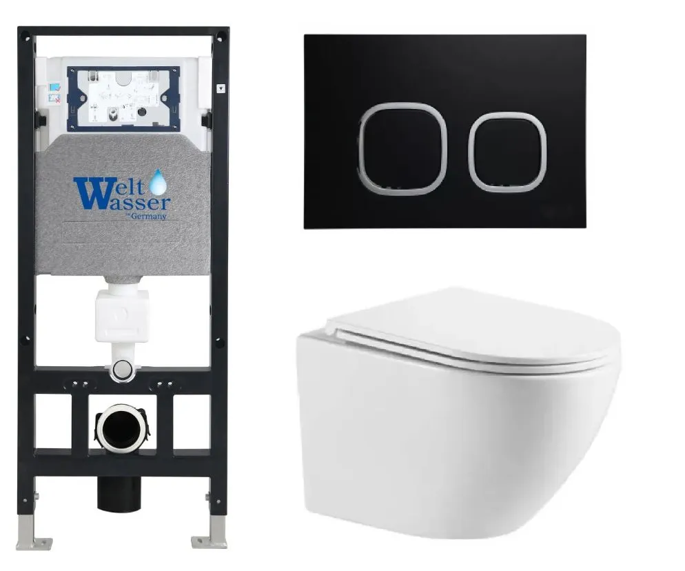 Инсталляция Welt Wasser AMBERG 506 + MERZBACH 043 XL GL-WT + AMBERG RD-BL в комплекте с унитазом, безободковый, с сидением микролифт