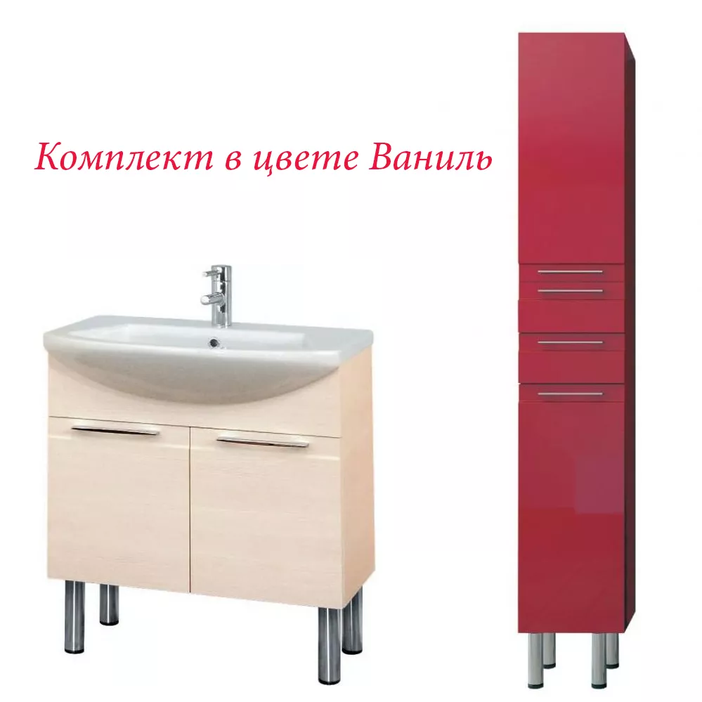 Комплектация СанВит - Sanvit Эдем 75 Эконом: тумба две распашные дверцы без доводчиков, на ножках + раковина керамическая белая + пенал Эдем цвет ваниль размером (ШхГхВ) 300х310х1920 мм.