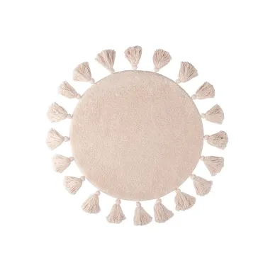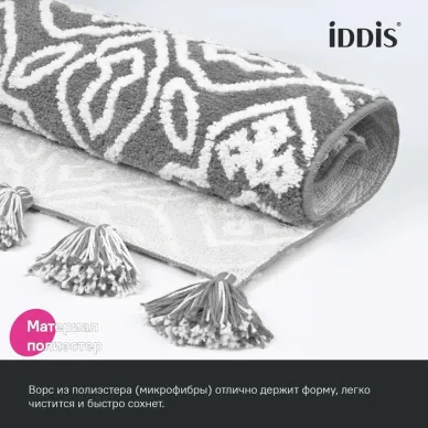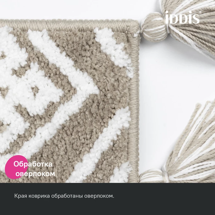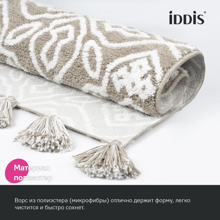 Мягкий бежевый коврик для ванной с декоративными пушистыми кисточками и белым узором, очень приятный на ощупь. Ворс из микрофибры отлично держит форму, легко чистится и быстро сохнет. Коврик подойдет для ванной и туалета, а также поможет создать уют в спальне или гостиной. • Коврик противоскользящий: основа из экологичной термопластичной резины (TPR) позволяет не скользить на гладком и влажном кафеле. Подходит для использования в помещениях с теплыми полами. • Благодаря современным влагостойким материалам и качественной обработке краев коврик не потеряет яркости красок, не обветшает и надолго останется привлекательным как в день покупки. • Рекомендуется ручная стирка при температуре до 40 градусов с жидким моющим средством; не сушить на батарее, избегать солнечных лучей. Гарантия на текстильные аксессуары IDDIS® – 1 год.