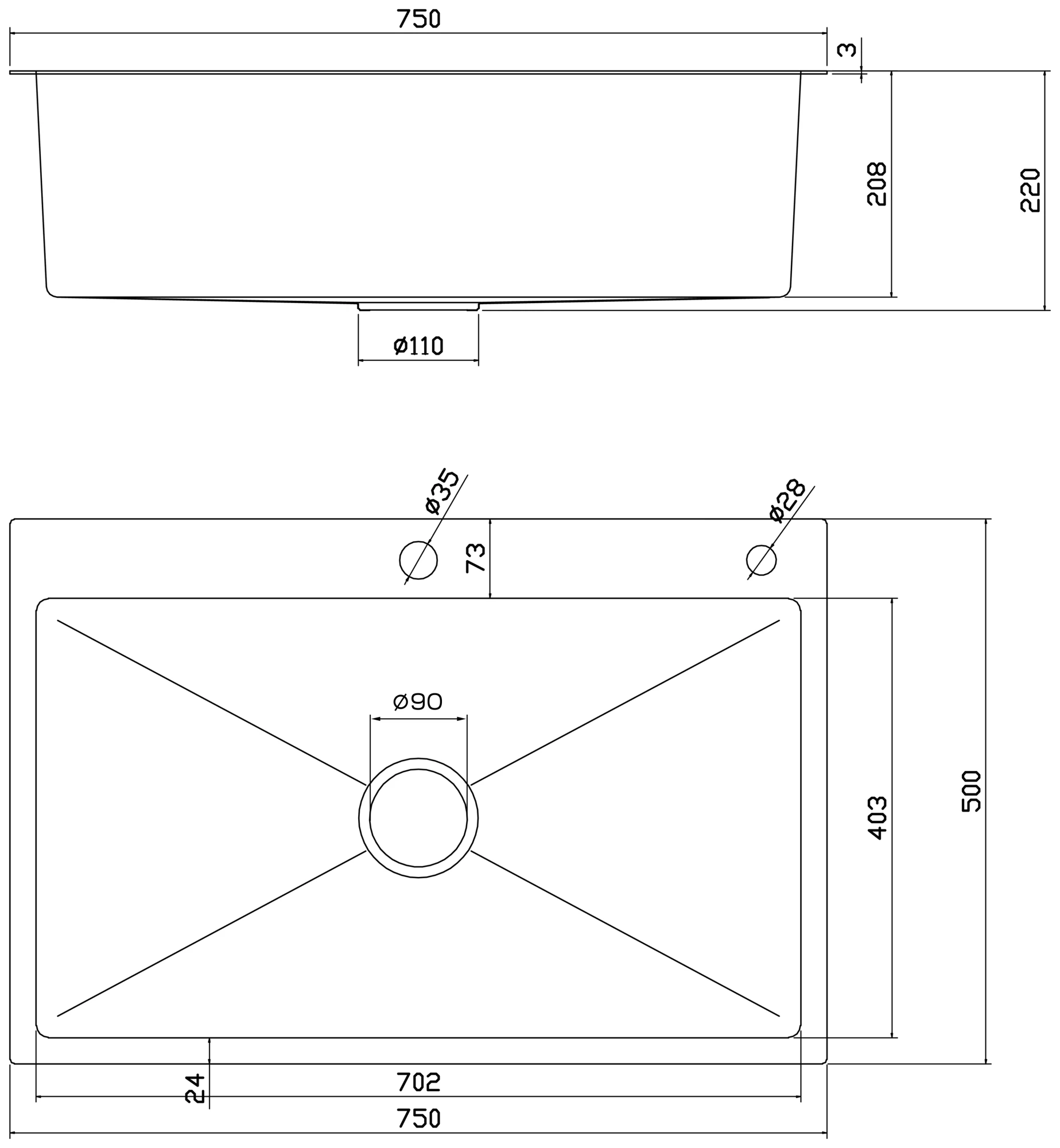 Диаметр сливного отверстия: 3½″ (90 мм)
