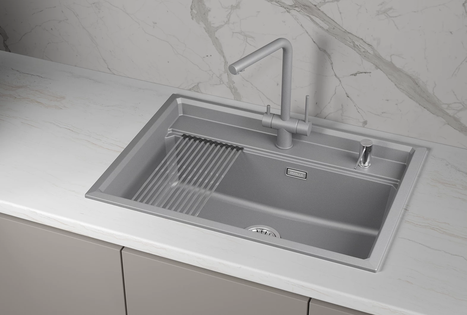 Granula - мойка российского производителя с широкой и вместительной чашей, идеально подходящей для крупной посуды. Изготовлена из кварцевого песка, она устойчива к царапинам и абразивам, а также не боится высоких температур. Модель Kitchen Space KS-7301 доступна в 4 цветах и содержит в комплекте сифон, дозатор для жидкого мыла и ролл-мат, который удобно устанавливается на специальную площадку внутри чаши.