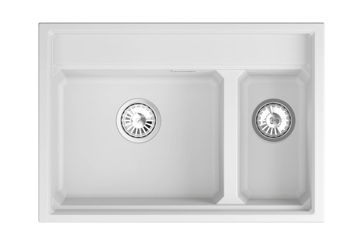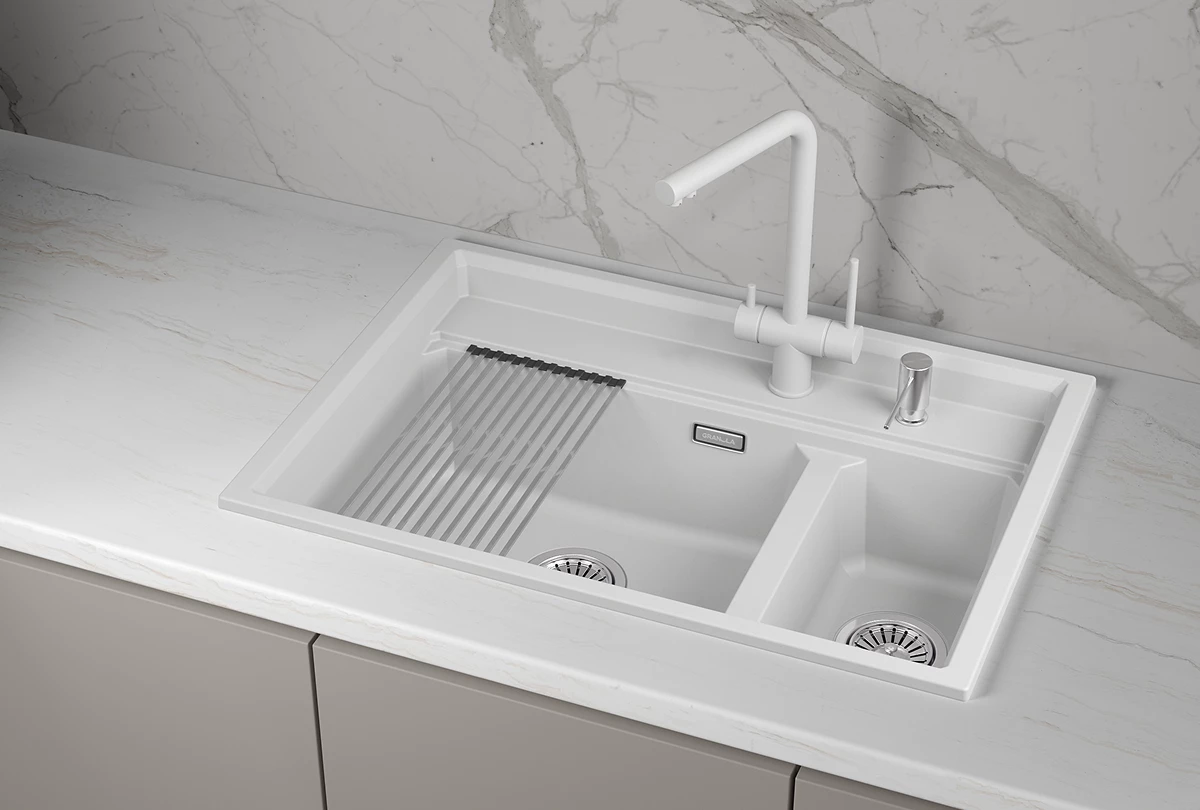 Мойка Granula с двумя чашами - идеальное решение для эффективной работы на кухне! Широкая чаша для мытья большой посуды, узкая чаша - для ополаскивания и мойки фруктов, овощей и мелкой посуды. Материал - кварцевый песок, прочный и износостойкий. Форма чаши адаптирована под функциональный ролл-мат. Мойка легко моется и устойчива к высоким температурам. В комплекте: ролл-мат, дозатор жидкого мыла, сифон.