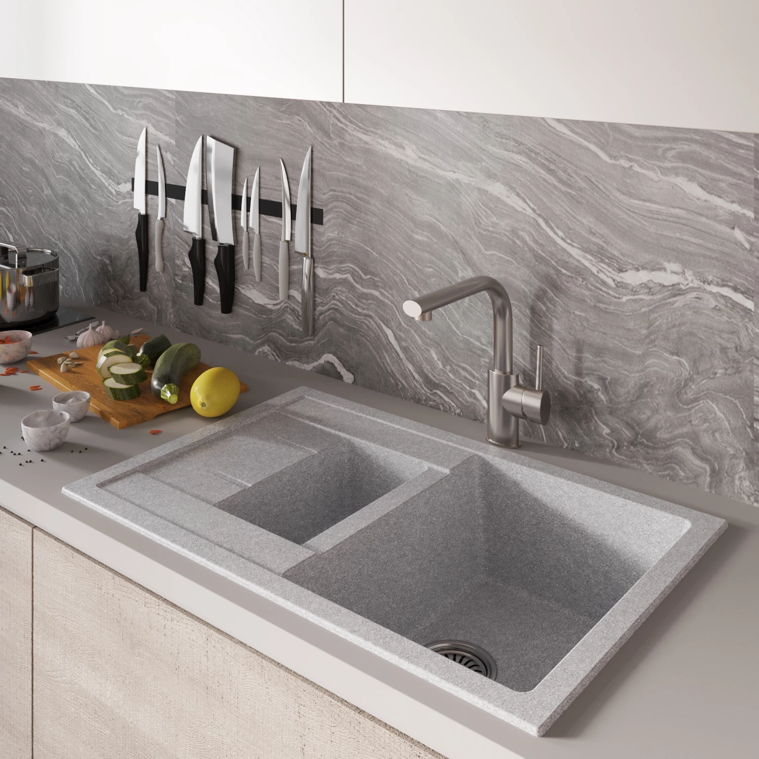 Мойки из искусственного мрамора ТМ Mixline являются практичным решением современного дизайна кухни. Искусственный мрамор представляет собой смесь мраморной крошки, полимерных смол и красящего пигмента в оптимальном соотношении. Такой состав придает материалу прочность, устойчивость к внешним воздействиям и значительно продлевает срок службы изделия. Мойки из искусственного мрамора ТМ Mixline покрыты специальным защитным слоем – гелькоутом. Он обеспечивает дополнительную безопасность и способствует большому сроку службы. Ассортимент моек из искусственного мрамора ТМ Mixline отличается как разнообразием форм и размеров, так и широкой цветовой палитрой. К каждой мойке можно подобрать идеально подходящий по цвету смеситель. Преимущества моек из искусственного мрамора ТМ Mixline: - механическая прочность и стойкость к повреждениям; - устойчивость к царапинам и перепадам температур; - устойчивость к ультрафиолету гарантирует длительное сохранение цвета; - реверсивная система моек: крыло можно поворачивать как вправо, так и влево; - мойки поставляются в комплекте с сифоном. Мойки из искуссвенного мрамора ТМ Mixline прослужат Вам длительный срок, не утрачивая как внешней привлекательности, так и своих эксплуатационных качеств.