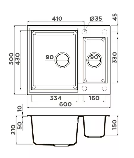 Размер мойки (ШхВхГ): 60x21х50 см.