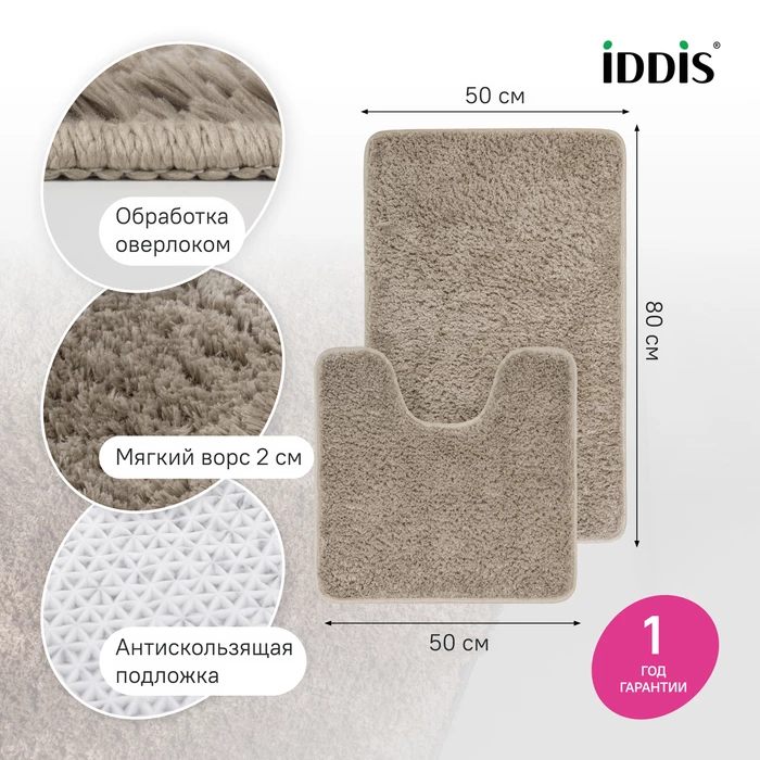 Набор из двух мягких ковриков для ванной светло-коричневого цвета с плотным высоким ворсом (2 см), очень приятных на ощупь. Стриженый ворс из микрофибры отлично держит форму, легко чистится и быстро сохнет. Коврики предназначены для ванной и для туалета (маленький коврик имеет вырез под унитаз). Коврики в ванную противоскользящие: основа из экологичной термопластичной резины (TPR) позволяет не скользить на гладком и влажном кафеле. Подходят для использования в помещениях с теплыми полами. Благодаря современным влагостойким материалам и качественной обработке краев коврики не потеряют яркости красок, не обветшают и надолго останутся привлекательными как в день покупки. Несложно ухаживать: разрешена деликатная стирка при температуре до 40 градусов с жидким моющим средством; не сушить на батарее, избегать солнечных лучей. Гарантия на текстильные аксессуары IDDIS® – 1 год.