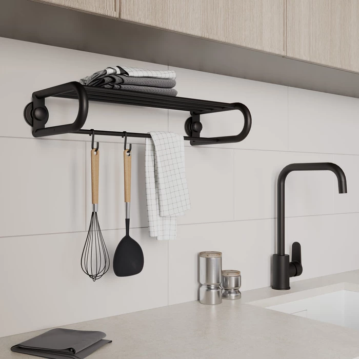 Полотенцесушитель Easy подходит для многих интерьерных решений и поддержания порядка в ванной или на кухне. Модель многофункциональна: например, она может использоваться как сушилка для полотенец или полка для хранения различных аксессуаров. В комплекте идут два съемных крючка под дополнительный текстиль или кухонные принадлежности: можно регулировать положение крючков и размещать аксессуары так, как удобно. Эта модель монтируется двумя фиксаторами на клеевой слой, дополнительно усиленный вакуумом, что увеличивает сцепку клеевой основы с поверхностью стены. В отличие от изделий из пластика полотенцесушитель Milardo® может выдерживать высокую (до 7 кг) нагрузку. Он монтируется без сверления, а значит можно не опасаться повредить красивую плитку или другое настенное покрытие. Высокопрочная порошковая покраска «черный муар» обеспечивает стойкую защиту от коррозии и создает привлекательный внешний вид. Гарантия на аксессуары для ванной комнаты Milardo® – 1 год.