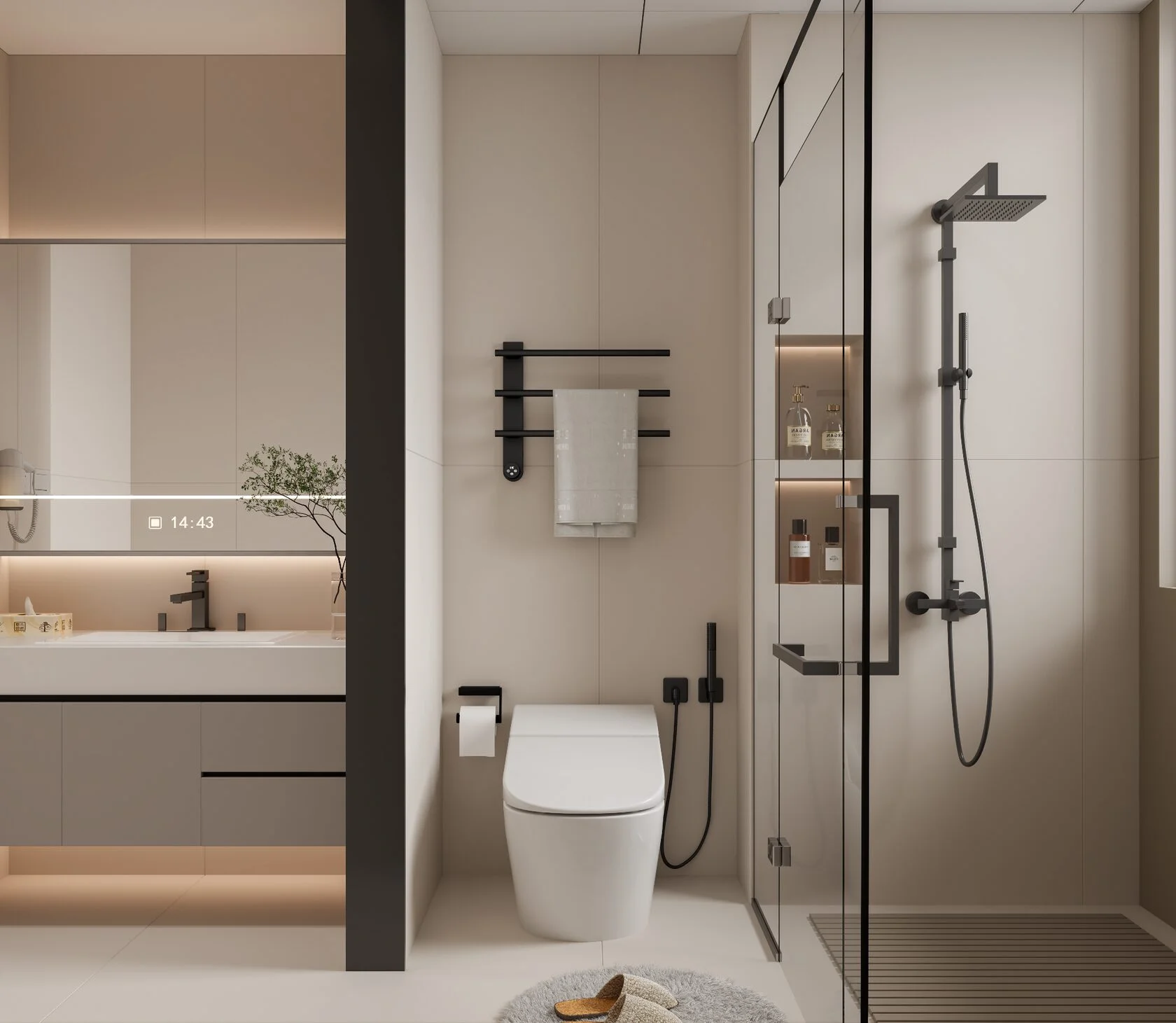 С терморегулятором, электронная панель управления, диапазон регулировки температуры 45-60 градусов, таймер включения и отключения, напряжение 220 вольт, влагозащищенность IPX4
