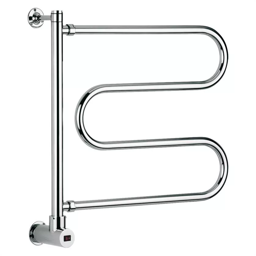 Полотенцесушитель электрический, поворотный на 180 градусов, скрытое электрическое соединение. Мощность: 100 Вт. Ширина 630 мм, высота 575 мм.