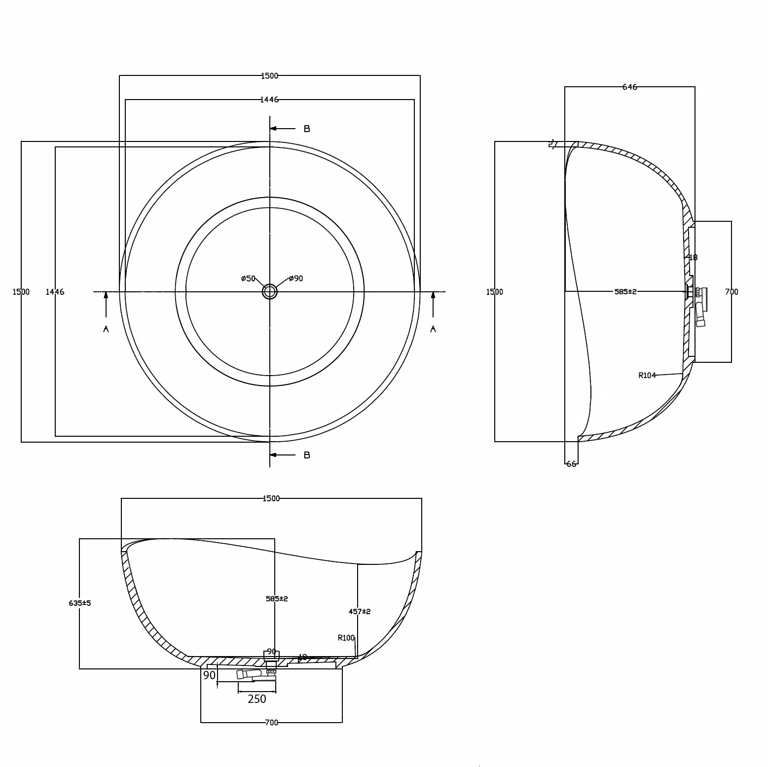 - Расположение слива: по центру.