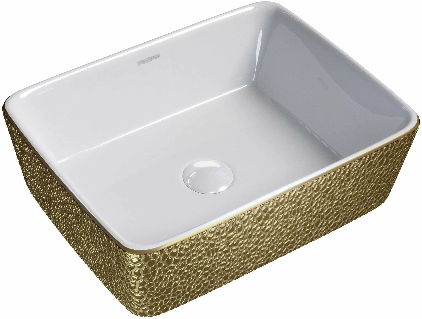 Раковина накладная Grossman GR-3016 золотого цвета и белого внутри выполнена из фарфора, имеет прямоугольную форму.