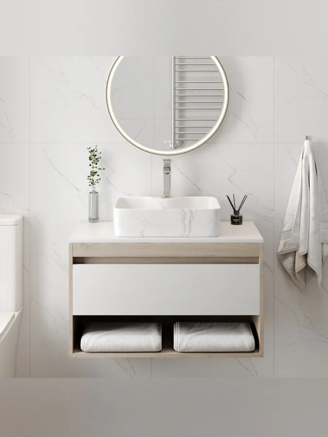 - Эстетика «Белый мрамор». Матовая поверхность с деликатными прожилками имитирует благородный камень. Такое покрытие не только выглядит стильно, но и практично в быту: на матовой фактуре менее заметны следы от воды и известковый налет, чем на классическом глянце.