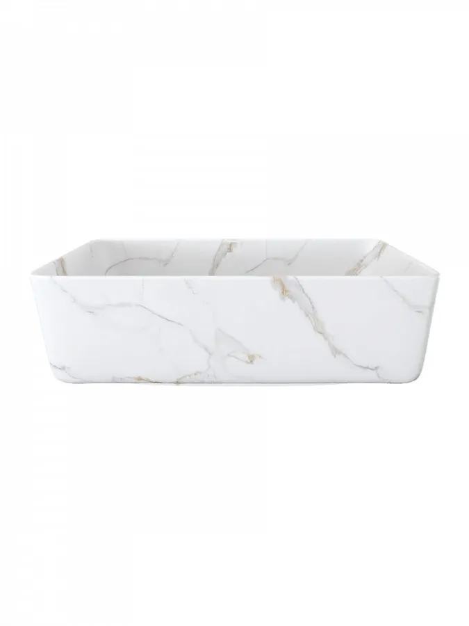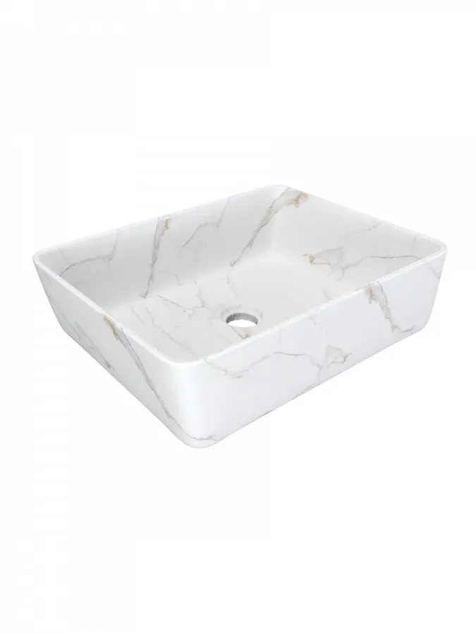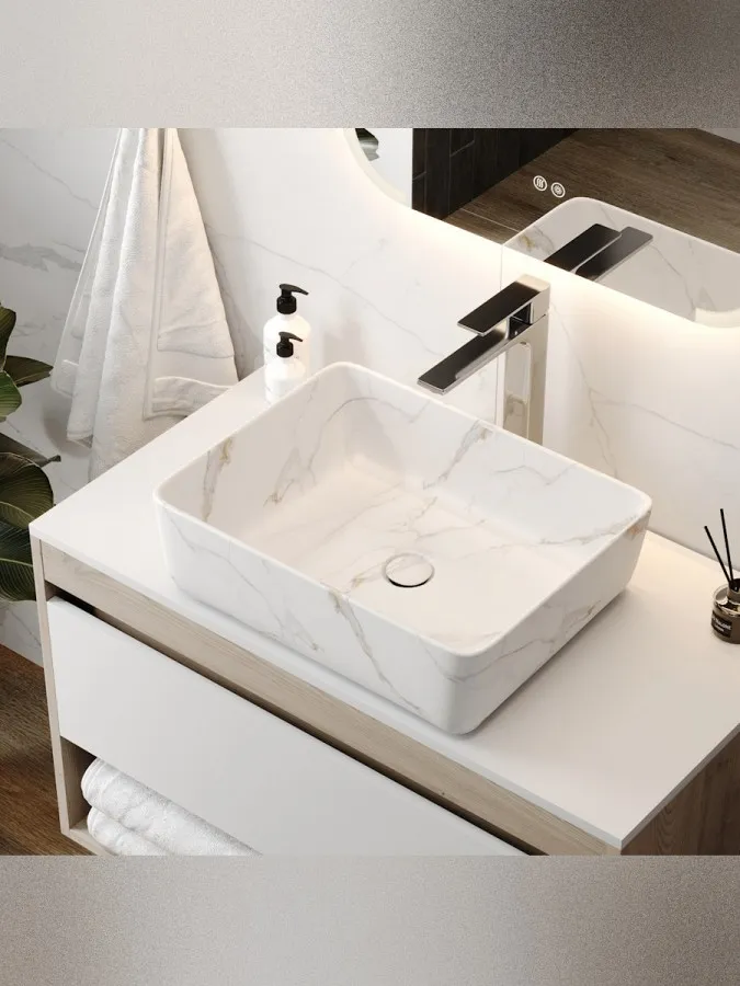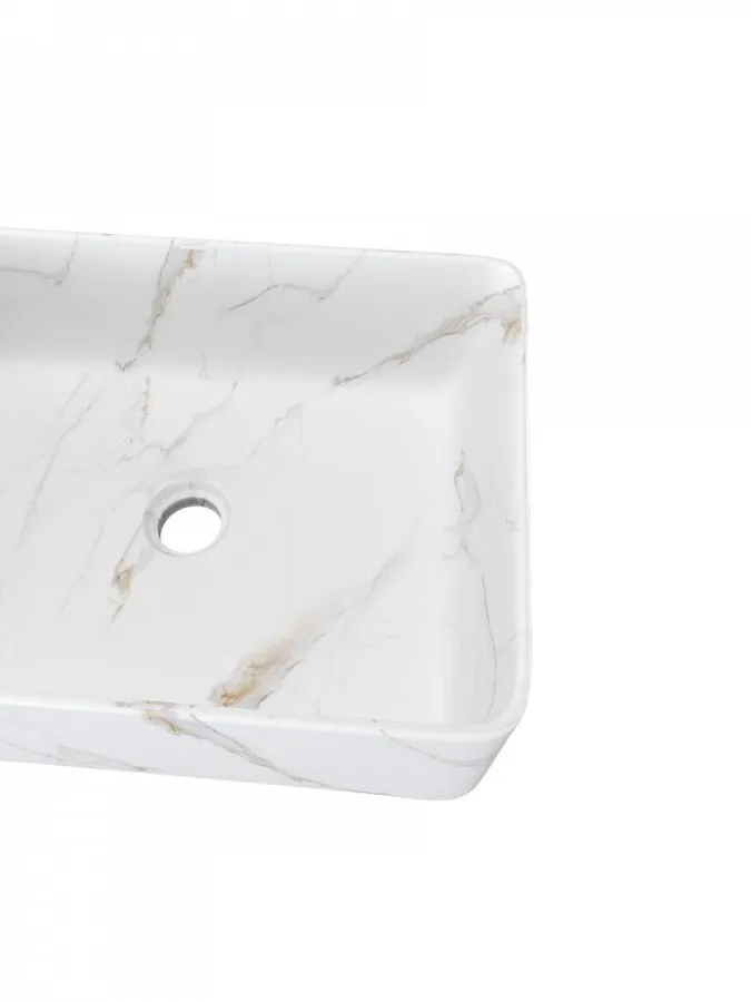 - Премиальный дизайн. Прямоугольная чаша с мягко скругленными углами выглядит лаконично и дорого. Матовая поверхность с имитацией мрамора не только притягивает взгляд, но и практична: на ней менее заметны высохшие капли воды, чем на глянце.