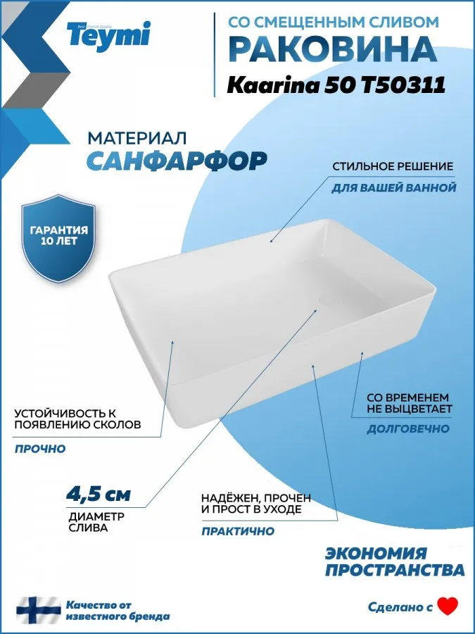 - Модель изготовлена из высококачественного санфарфора, который обеспечивает высокую прочность и гигиеничность. Белоснежная глянцевая поверхность устойчива к загрязнениям, легко очищается и надолго сохраняет свой первоначальный блеск. Надёжность изделия подчёркивается 10-летней гарантией от бренда Teymi. Раковина Kaarina 50 белая станет центральным элементом вашей ванной, объединяя смелый дизайн и безупречное качество.