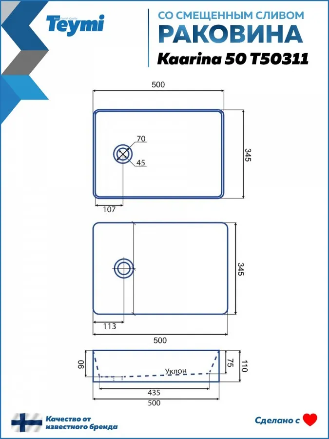 - Накладная раковина Teymi Kaarina 50 белая T50311 — это воплощение современного минимализма и функциональности. Её чистые линии с закругленными углами и лаконичный дизайн станут идеальным дополнением для интерьера в стиле лофт, хай-тек или минимализм. Ключевая особенность модели — смещённый слив, который добавляет динамики и асимметрии в строгую геометрию, делая раковину настоящим дизайнерским акцентом.