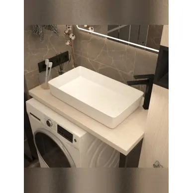 - Отсутствие отверстия под смеситель предоставляет полную свободу в оформлении пространства: вы можете использовать настенный или высокий отдельностоящий смеситель, создавая по-настоящему индивидуальный интерьер. При ширине 60 см и глубине 34,5 см раковина является достаточно вместительной и удобной для повседневного использования, а небольшая высота (11 см) подчёркивает её изящный силуэт.