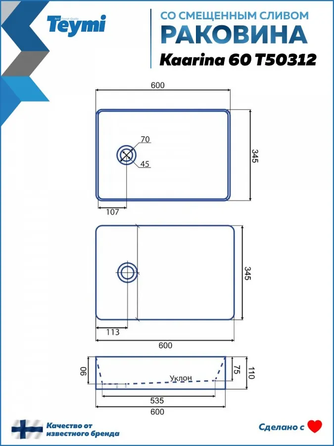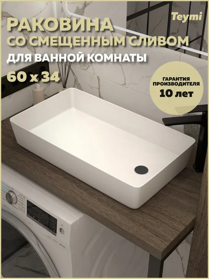 - Накладная раковина Teymi Kaarina 60 белая T50312 — это воплощение современного минимализма и функциональности. Её чистые линии с закругленными углами и лаконичный дизайн станут идеальным дополнением для интерьера в стиле лофт, хай-тек или минимализм. Ключевая особенность модели — смещённый слив, который добавляет динамики и асимметрии в строгую геометрию, делая раковину настоящим дизайнерским акцентом.