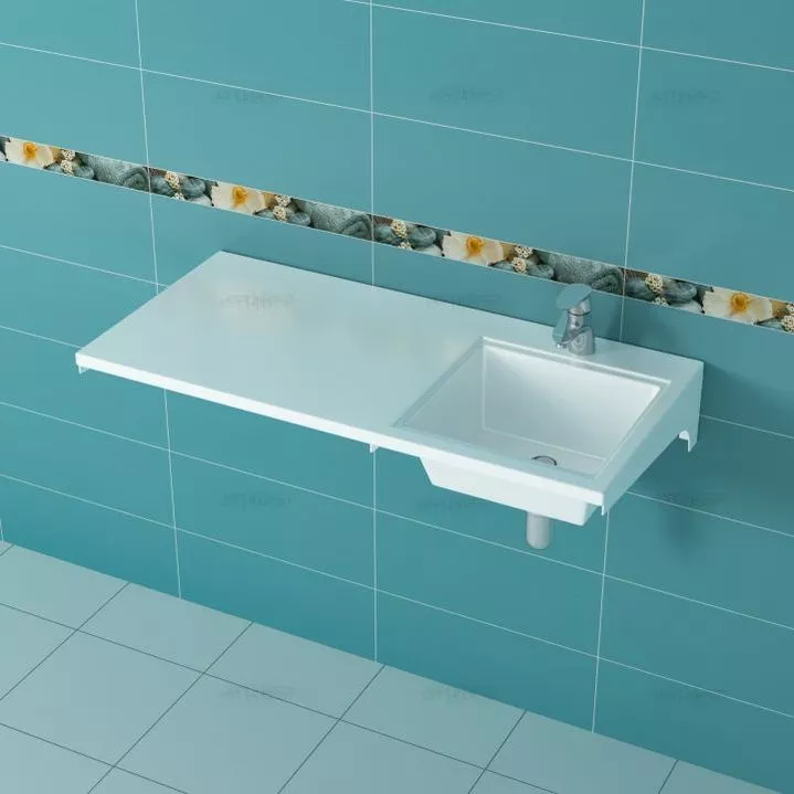 Раковина над стиральной машиной "Лидер" со смещённой чашей размером 1100*480 мм выполнена в современном дизайне. Особенность этой раковины в совмещении в одно целое раковины и столешницы находящейся над стиральной машиной. Есть несколько вариантов установки раковины. Она может быть установлена с одной стороны на тумбу, и с другой стороны краем крыла на кронштейн. Возможно установить её только на 3 кронштейна (боковые и центральный). Чаша раковины имеет прямоугольную форму. На широком крыле раковины очень удобно размещать гигиенические принадлежности. Материал раковины литьевой мрамор. Кронштейны приобретаются отдельно.