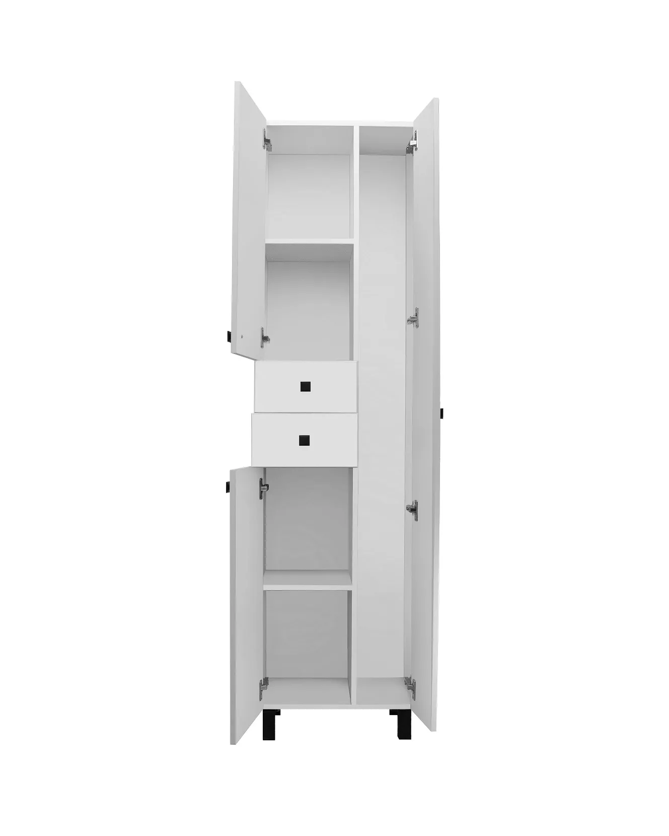 Шкаф-колонна напольный, справа - отделение для халатов с распашной дверью, слева -две дверцы и два выдвижных ящика. В нижнем и верхнем отделениях - по одной внутренней полке. Ящики - на шариковых направляющих, петли со встроенным доводчиком, ручки - 5шт, крючок - 1шт, ножки хром - 2 шт, ножки пластик -2шт. Выпускается только в правом исполнении