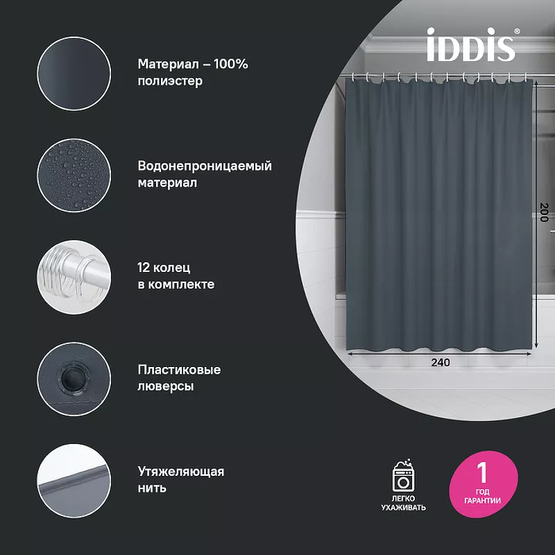 - Шторка для ванной Iddis Base (BBL01P24i11) 200x240 см, серый