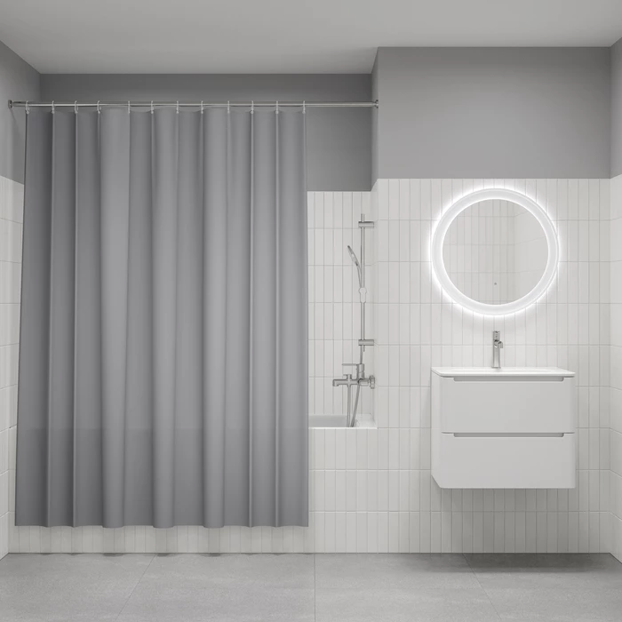Текстильная светло-серая штора для ванной будет гармонично смотреться и в светлом, и в темном интерьере. Увеличенный размер – 200х240 см. Изготовлена из износостойкого полиэстера с водоотталкивающей пропиткой. При попадании на ткань вода не впитывается, а скатывается каплями, даже при сильном напоре воды. В комплекте 12 колец С-формы из прозрачного пластика. По верхнему краю расположены 12 прозрачных пластиковых люверсов. Штора имеет утяжеляющую нить по нижнему краю, которая позволяет избежать задирания ткани. Легко ухаживать: шторку для ванной комнаты можно стирать в стиральной машине в деликатном режиме и гладить утюгом на минимальной температуре. Гарантия на текстильные аксессуары IDDIS® – 1 год.