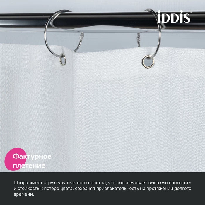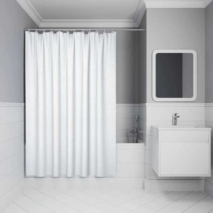 Однотонная плотная текстильная штора для ванной белого цвета с фактурой натурального льна, что делает ее элегантной и утонченной. Напоминает классические текстильные шторы и соответствует актуальному тренду оформления ванной как уютной жилой комнаты. Изготовлена из износостойкого полиэстера с водоотталкивающей пропиткой. При попадании на ткань вода скатывается каплями. По верхнему краю расположены 12 хромированных металлических люверсов. Без колец в комплекте. Штора имеет утяжеляющую нить по нижнему краю, которая позволяет избежать задирания ткани. Легко ухаживать: шторку для ванной комнаты можно стирать в стиральной машине в деликатном режиме и гладить утюгом на минимальной температуре. Гарантия на текстильные аксессуары IDDIS® – 1 год.