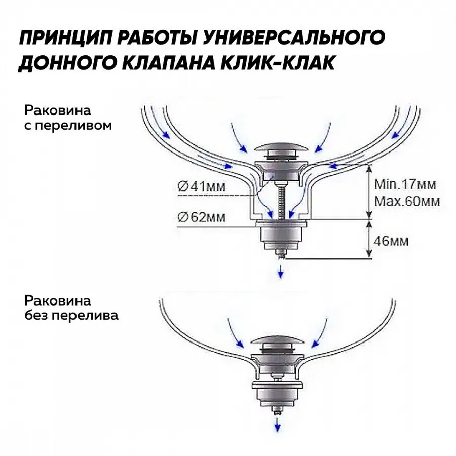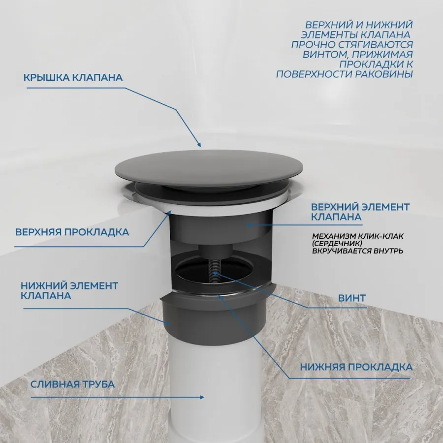 Донный клапан click-clack – это не просто элемент сантехники, а продуманное решение для комфортного использования, его конструкция позволят одним нажатием открыть или закрыть клапан, что существенно упрощает эксплуатацию.