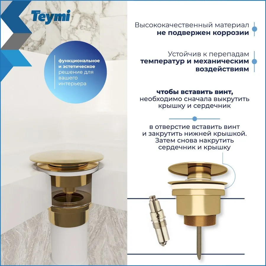 Донный клапан с переливом Teymi Lina для раковины, золото глянцевый T140215 – стильное и функциональное решение для современной ванной комнаты, которое подчеркнет изысканность интерьера и станет безупречным дизайнерским акцентом.