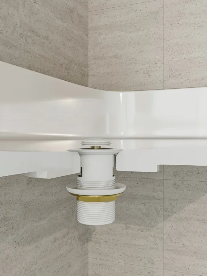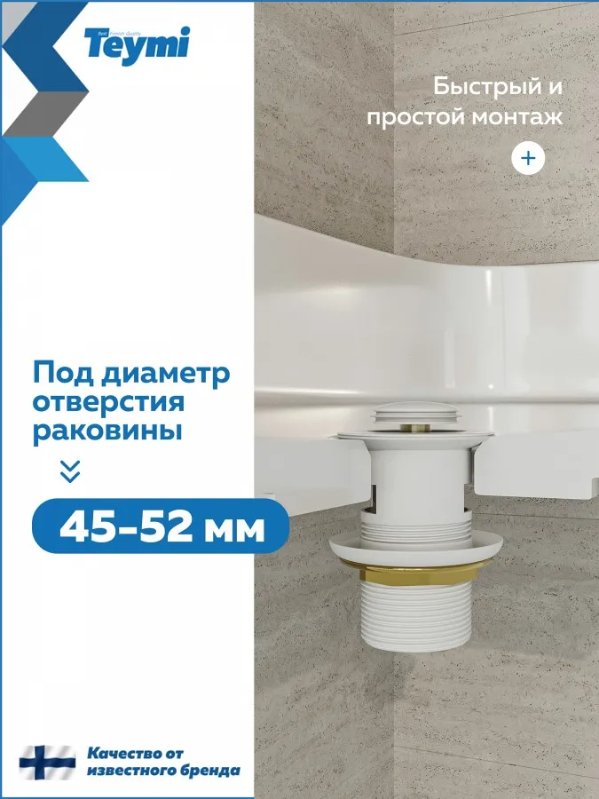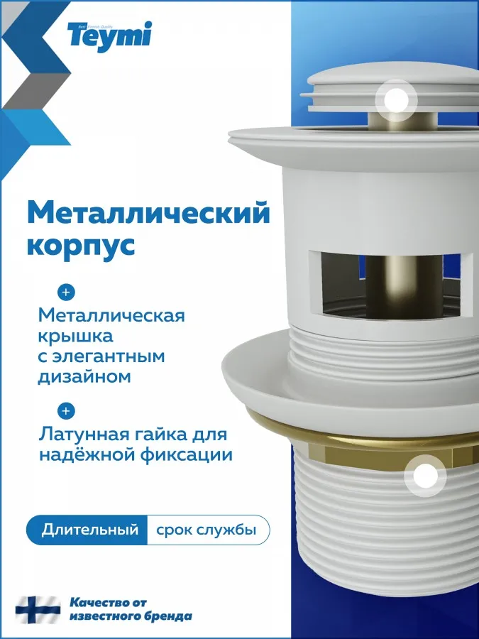 - Белая матовая крышка делает клапан универсальным решением для керамических и санфарфоровых раковин в светлых тонах, идеально сочетается с сантехникой коллекций Teymi и подчеркивает современный стиль интерьера.