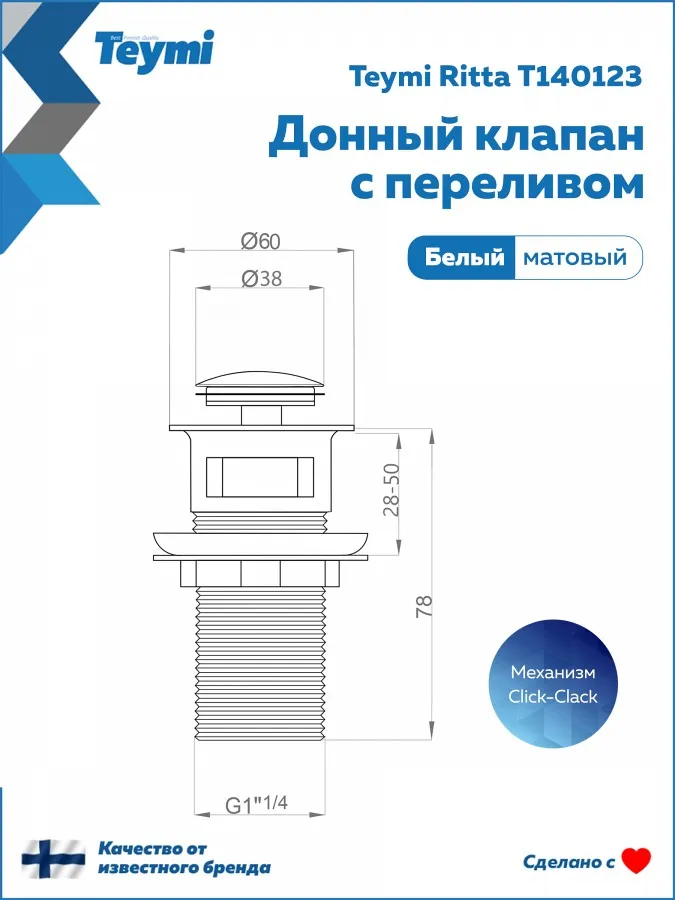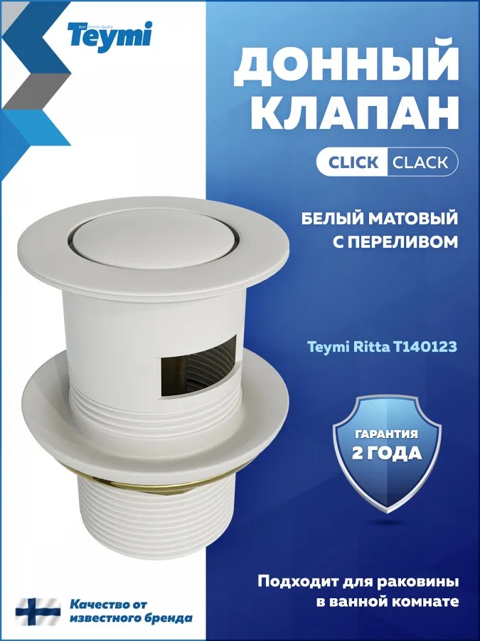 - Донный клапан для раковины с переливом Teymi Ritta белый матовый T140123 — функциональный и эстетичный аксессуар, созданный для современных ванных комнат, где ценится сочетание надежности и дизайна.