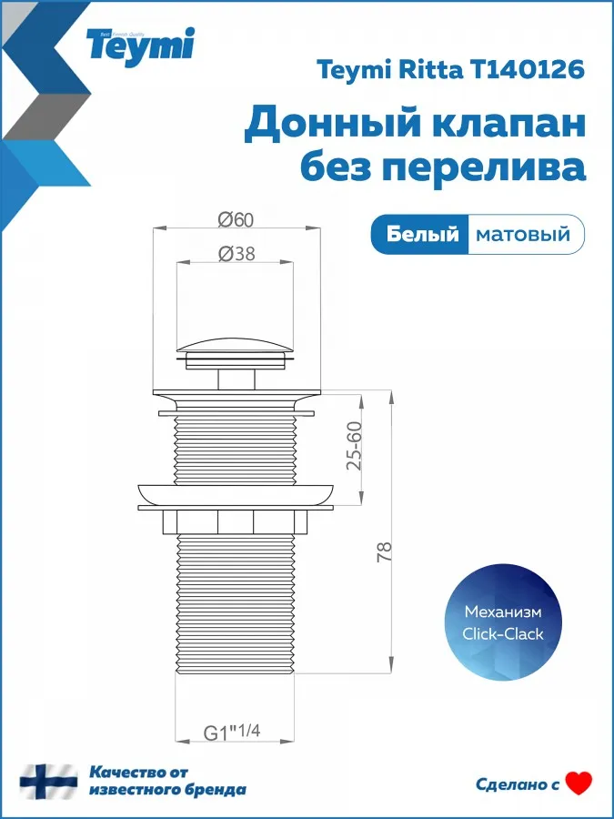 - Донный клапан для раковины без перелива Teymi Ritta белый матовый T140126 — функциональный и стильный аксессуар для современной ванной комнаты.
