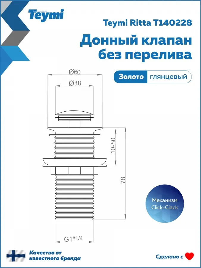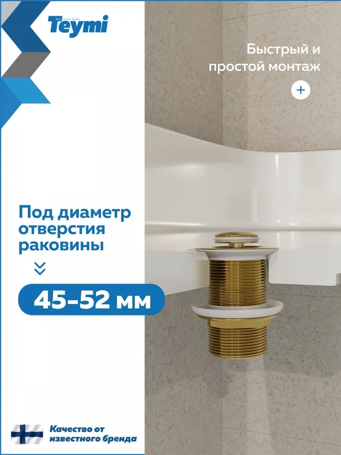 - Донный клапан для раковины без перелива Teymi Ritta золото глянцевый T140228 — элегантное и надежное решение для современной ванной комнаты, где ценят стиль и практичность.