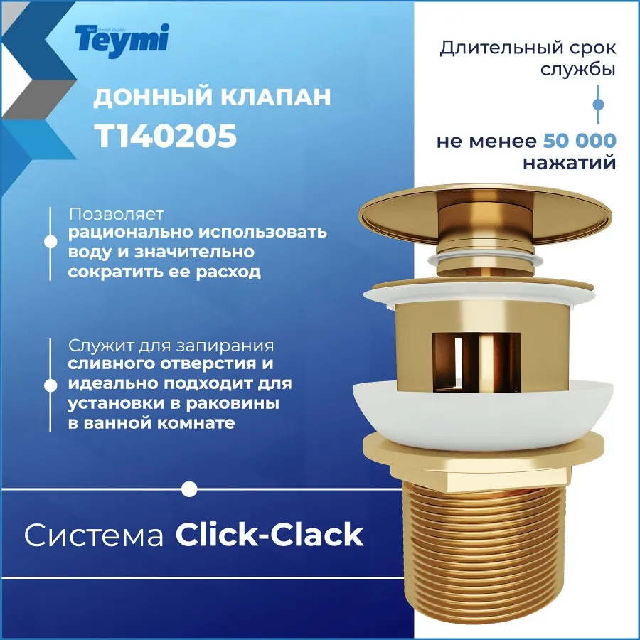 Сливной набор для раковины Teymi Solli T140205 с переливом, click-clack, золото