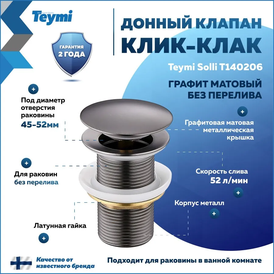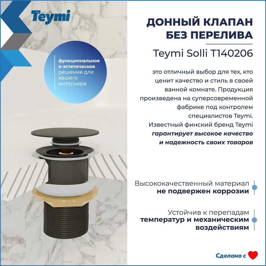 Донный клапан без перелива Teymi Solli для раковины, графит матовый T140206 – стильное и функциональное решение для современной ванной комнаты, которое подчеркнет изысканность интерьера и станет безупречным дизайнерским акцентом.