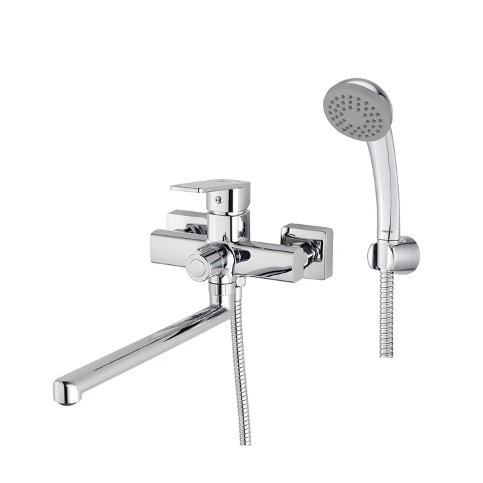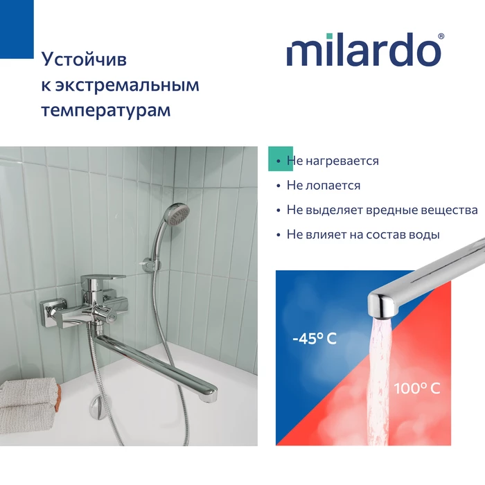 Смеситель Poli создан под проекты современных интерьеров: умеренно геометричные линии модели подойдут к сантехнике и мебели, как квадратных, так и скругленных форм. С длинным (29 см) изливом использовать пространство ванной получается намного эффективней, а поворотный излив позволяет охватить большую ее площадь. Цельный корпус смесителя для ванны выполнен из современного полимерного сплава, используемого для магистральных трубопроводов. Такой материал не содержит и не выделяет в воду вредные примеси; не разрушается под воздействием влаги, солей и хлора. Пластик обладает высокой термоустойчивостью, не нагревается и не обжигает при эксплуатации. Высокая ударопрочность сохраняется даже при экстремально низких температурах, что помогает подготовиться к дачному сезону в любых условиях или избежать протечек при отключении горячего водоснабжения в квартире. Ручная однорежимная лейка, душевой шланг (1,5 м) в оплетке из нержавеющей стали и крепеж идут в комплекте. Поворотный дивертор работает при любом давлении воды, переключая поток воды с излива на душевую лейку. Оптимальная толщина никель-хромового покрытия защищает смеситель от образования трещин и сколов, продлевает срок его службы.